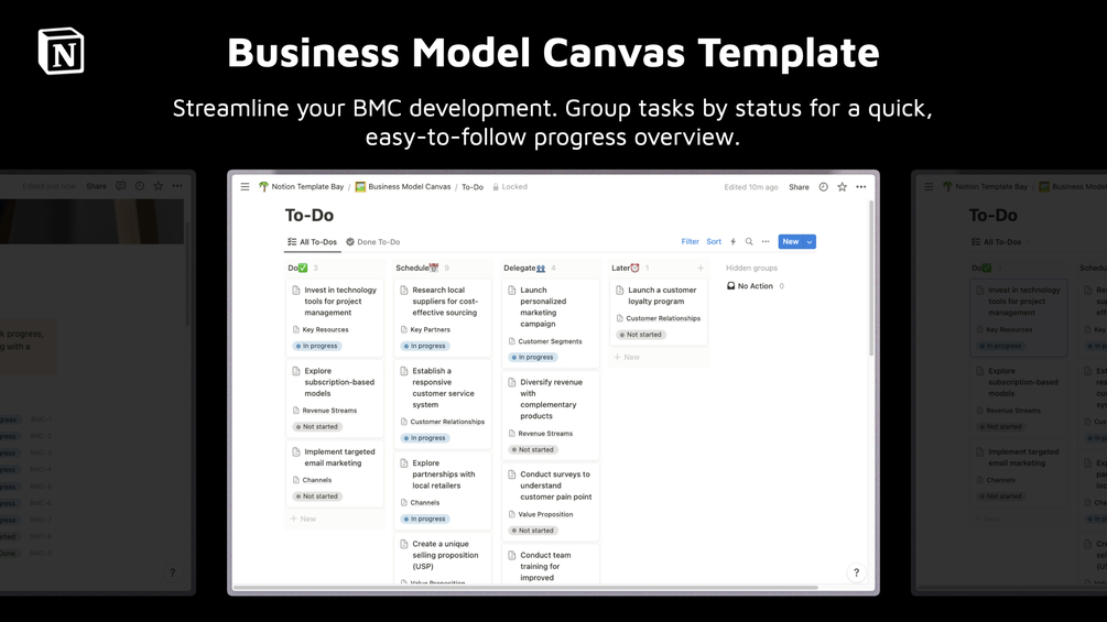 Streamline your BMC development. Group tasks by status for a quick, easy-to-follow progress overview.